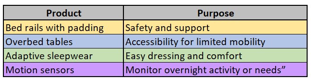 Pressure-relieving mattresses and cushions for people with mobility limitations (e.g., memory foam, air mattresses). Positioning aids like body pillows or wedge cushions to support posture and prevent bedsores. Adjustable beds for people with spinal cord injuries, cerebral palsy, or chronic pain. White noise machines or blackout curtains for individuals with sensory sensitivities (e.g., autism, PTSD).
